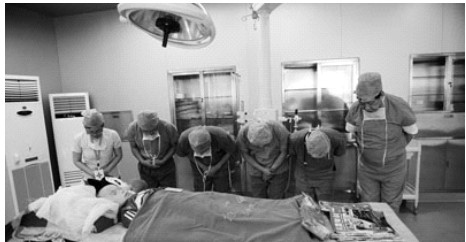 昨天上午10时,小军豪(化名)的遗体告别仪式在昆明市第一人民医院手术室举行。小军豪躺在手术台上,神态安详,枕旁有鲜花和漂亮的布娃娃,几名主刀医生神情凝重,一齐向小军豪的遗体鞠躬。