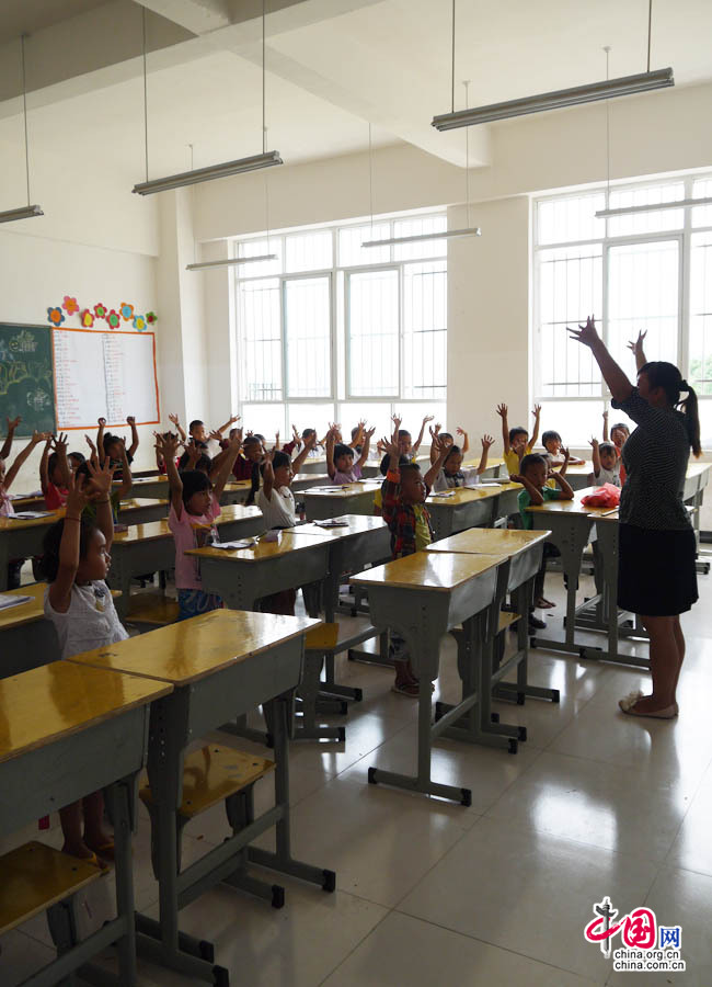 老师带着同学们一起“手舞足蹈”的上课。中国网王婷摄 在云南盈江县第四幼儿园的教室里,老师正用“手舞足蹈”的方式给活泼好动的学生们上课,这些一年级的可爱的孩子们也高兴地跟着老师一起舞动着手脚,课堂的气氛快乐又轻松,大家在一边玩一边学。到课间休息的时候,许多男孩子就一哄出了教室,这跑跑那晃晃,感觉总也闲不下来,女孩子们则安静的找点自己的事情做,或者聚在一起闲聊,相同的是他们的脸上总是挂着笑容。 随意走进一间教室,可以看到黑板报上写着“六一儿童节快乐”的字样,想必这个刚刚过去的儿童节也给同学们带来了不少的欢乐。种种欢乐的气氛让这所小学看上去和普通的小学没有太多的差别,只有从一些细节上,如建筑工程竣工标志牌的文字说明中才能看出这是一所经历地震之后灾后重建的小学。 盈江县第四小学(原岗勐小学)在“3•10”地震中学校全部校舍、教学设备和实验仪器损毁严重。而如今,重建后的校园焕然一新,高大的教学楼,整洁的学生宿舍,宽敞的运动场,对孩子们来说确实可以算得上是一个漂亮的学校。 据介绍,盈江县第四小学重建后的校舍建筑面积达6120平方米,包括教学楼、学生宿舍楼、学生食堂、教师周转房等,总投资2000余万元,新建运动场已完工验收,总投资150万元。目前第四小学办学规模达18个教学班,在校学生805人(含学前班),其中少数民族学生422人,占全校学生的65%。(记者王婷) |